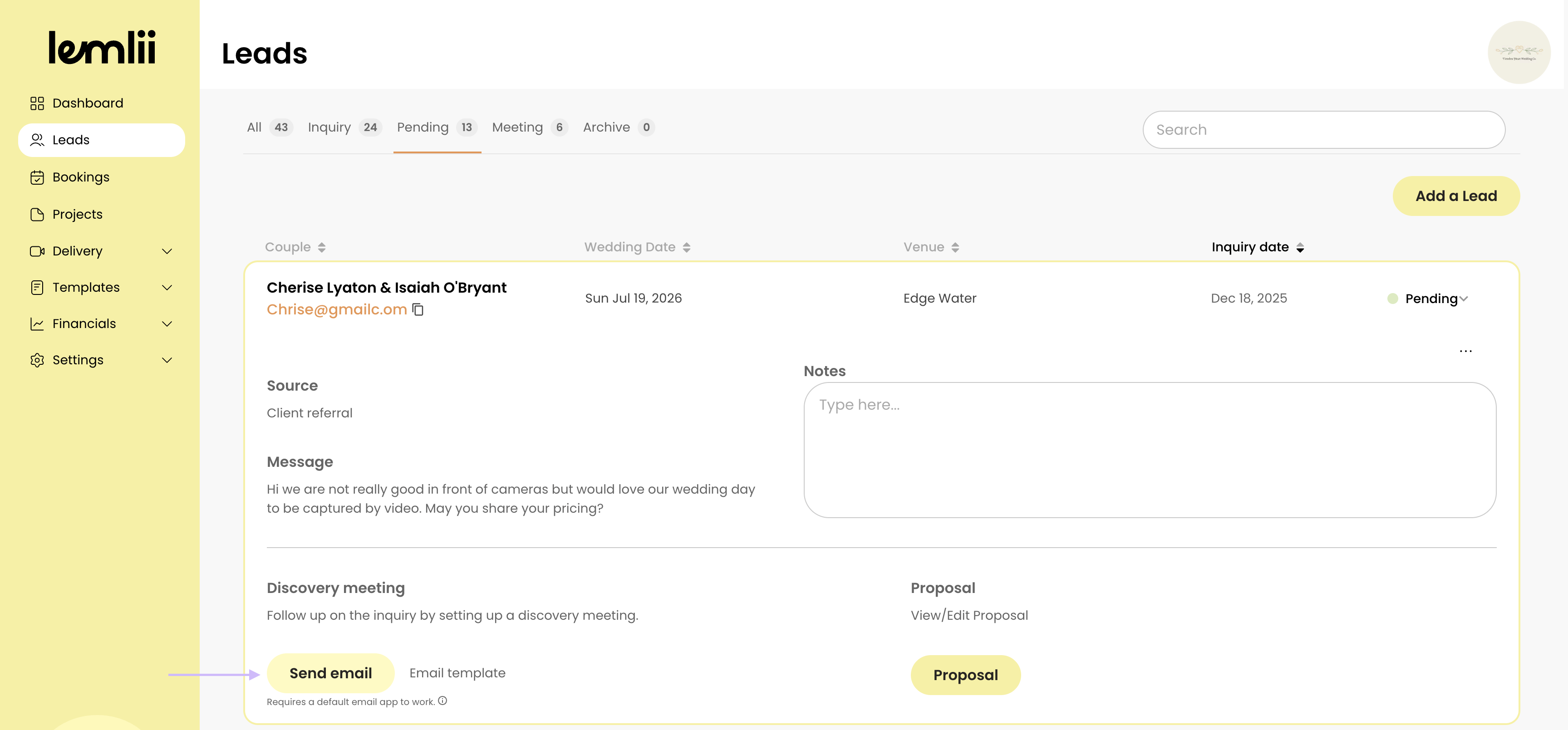 It arrives in your inbox fully drafted, including the couple’s contact info and wedding details. You get the nudge, you tweak the intro, and then you hit send.